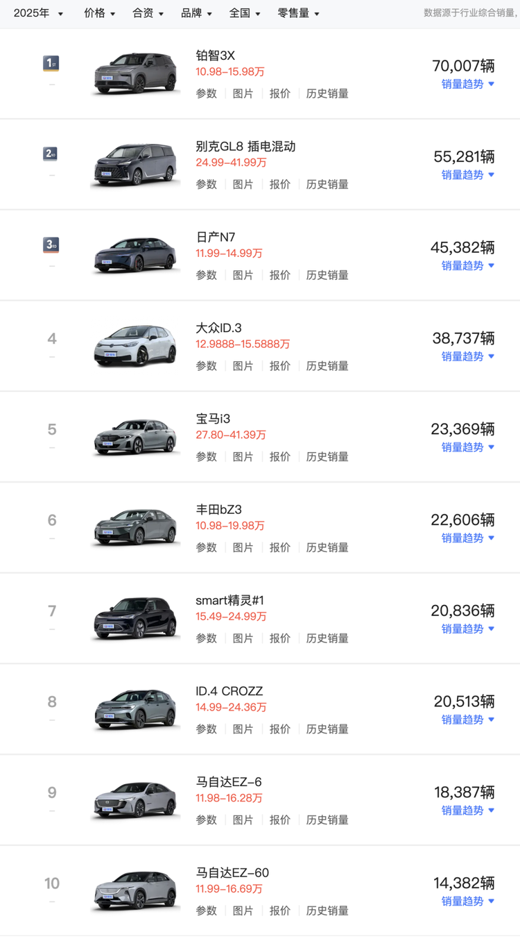可以简单回顾一下,2025 年的合资新能源按年销量排序,依次为广丰铂智 3X、别克 GL8 插混、日产 N7、大众 ID.3、宝马 i3、一汽丰田 bZ3、smart 精灵 #1、大众 ID.4 Crozz、马自达 EZ-6 和马自达 EZ-60。