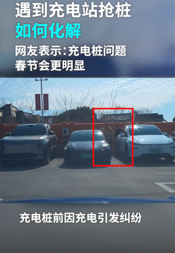 某公共充电站(无事发具体时间、地点等相关描述),两辆特斯拉汽车和另一品牌的未上市车型同框出现;后两名电动汽车司机因充电产生纠纷,后续左侧SUV司机下车劝说,而后让出充电桩自行驶离。