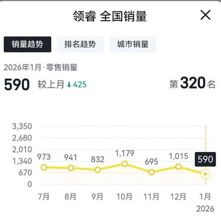 根据第三方平台公布的2025年1月份的零售零量可以看到,今年1月份,江铃福特旗下销量最高的车型为领睿,1月份的销量为590辆,相比2025年12月份的销量1015辆,环比下滑41.87%,同时相比2025年1月份的销量1714辆,同比下滑65.57%。