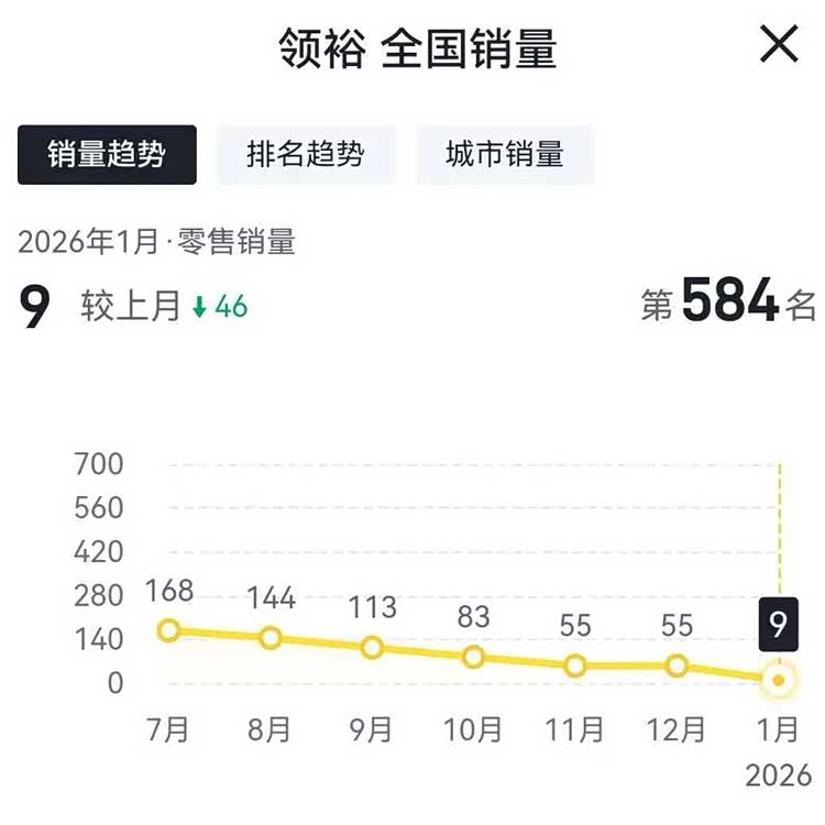 而江铃福特领裕在今年1月份的销量仅为9辆,相比2025年12月份的销量55辆,环比下滑83.63%。