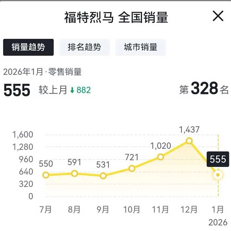 福特烈马在今年1月份的销量为555辆,相比2025年12月份的销量1437辆,环比下滑61.37%。