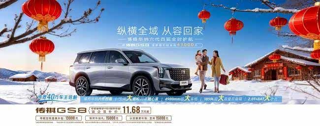 新年开新车,万事皆可期。这个春节,不用再为空间局促、路况难行、购车预算不足而烦恼,传祺GS8以大空间、强动力、高安全、高保值,搭配12万超值入手价,让每一个家庭都能轻松拥有体面出行的底气。