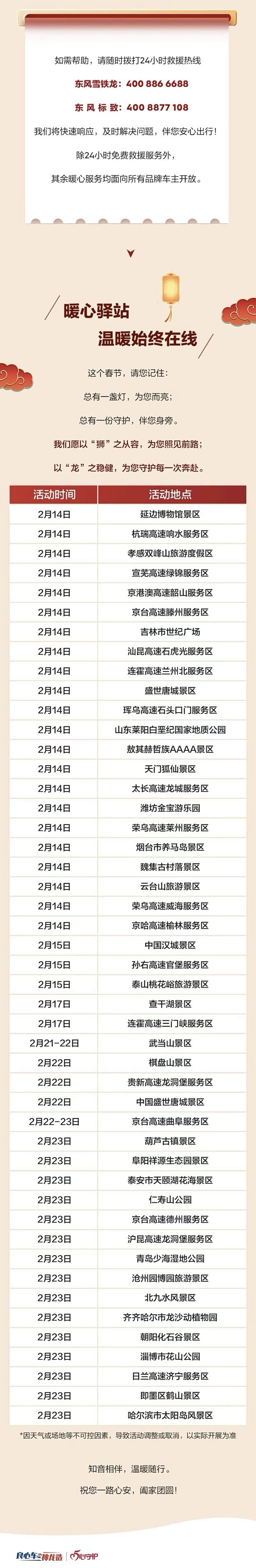 春运路上,平安是最深的牵挂。以“狮舞龙腾 暖心护航”为主题,东风标致与东风雪铁龙联动全国49家经销商,自2月14日起在高速公路服务区及热门景区设立47处“暖心驿站”,守护用户的节日出行。