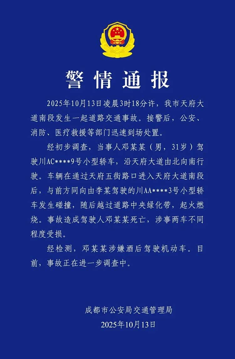随后针对该起事故,四川成都警方发布通报。通报内容指出经初步调查,当事人邓某某(男,31岁)驾驶川AC****9号小型轿车,沿天府大道由北向南行驶。车辆在通过天府五街路口进入天府大道南段后,与前方同向由李某驾驶的川AA****3号小型轿车发生碰撞,随后越过道路中央绿化带,起火燃烧。事故造成驾驶人邓某某死亡,涉事两车不同程度受损。经检测,邓某某涉嫌酒后驾驶机动车。目前,事故正在进一步调查中。