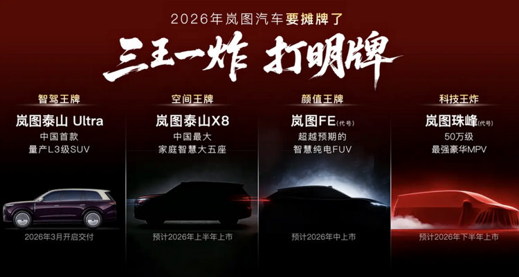 如果说上市是岚图的“资本大招”,那么 2026年的新车投放 则是其抢占市场的“组合拳”。今年,岚图计划推出 4款全新车型,全面布局新能源汽车市场。