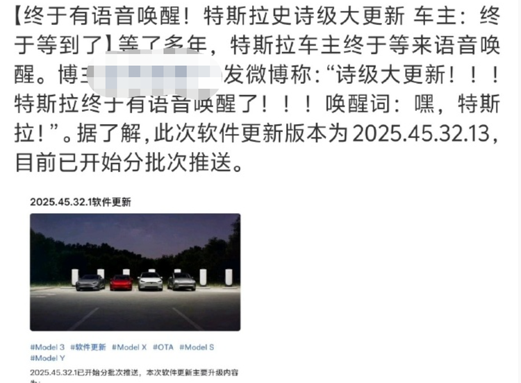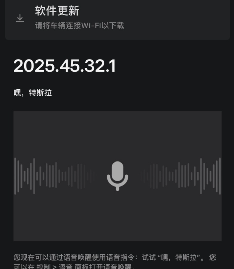 此次更新的版本属于2025 45.3 12:13,目前这批新软件已经开始分批推送,那就是语音唤醒功能,而唤醒词则是hi特斯拉。