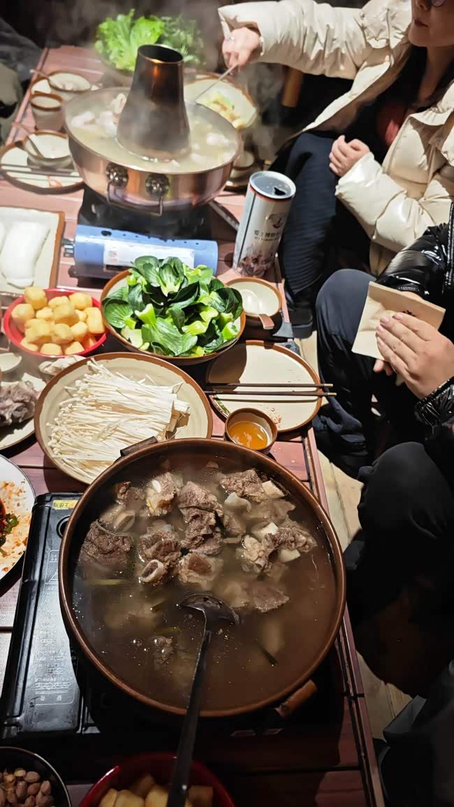 老板拿出祖传的羊肉火锅和牛肉火锅招待我们!吃着火锅,唱着歌!不亦快哉!