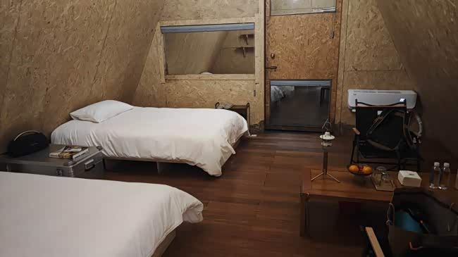 木屋内布置比较简洁,两个木床中间是个大铝箱充当床头柜,上面放着哈曼卡顿的音响,老板品味不错!