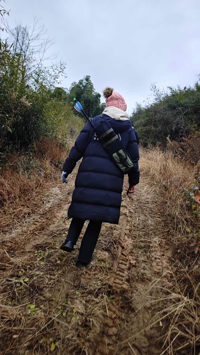 背上箭袋,拿上长弓,我们上山打野啦!可别说,这把铝合金制作的复合弓还真挺沉,拿在手里把玩一会还不觉得啥,但是拎着上山走一段山路可真是够呛,手都酸了!