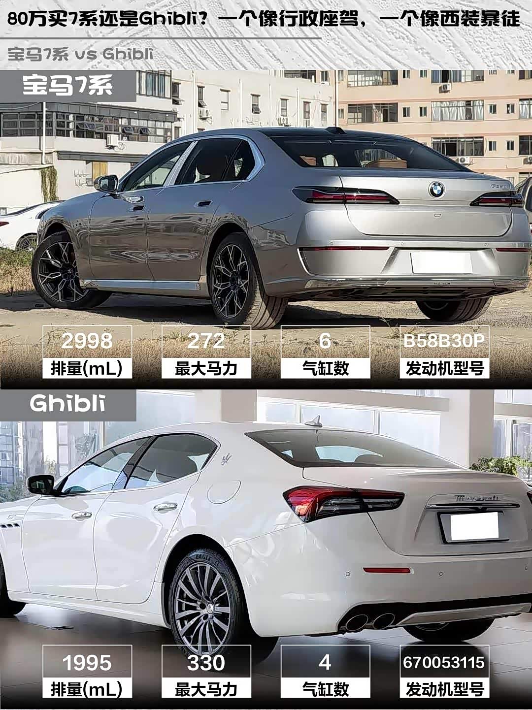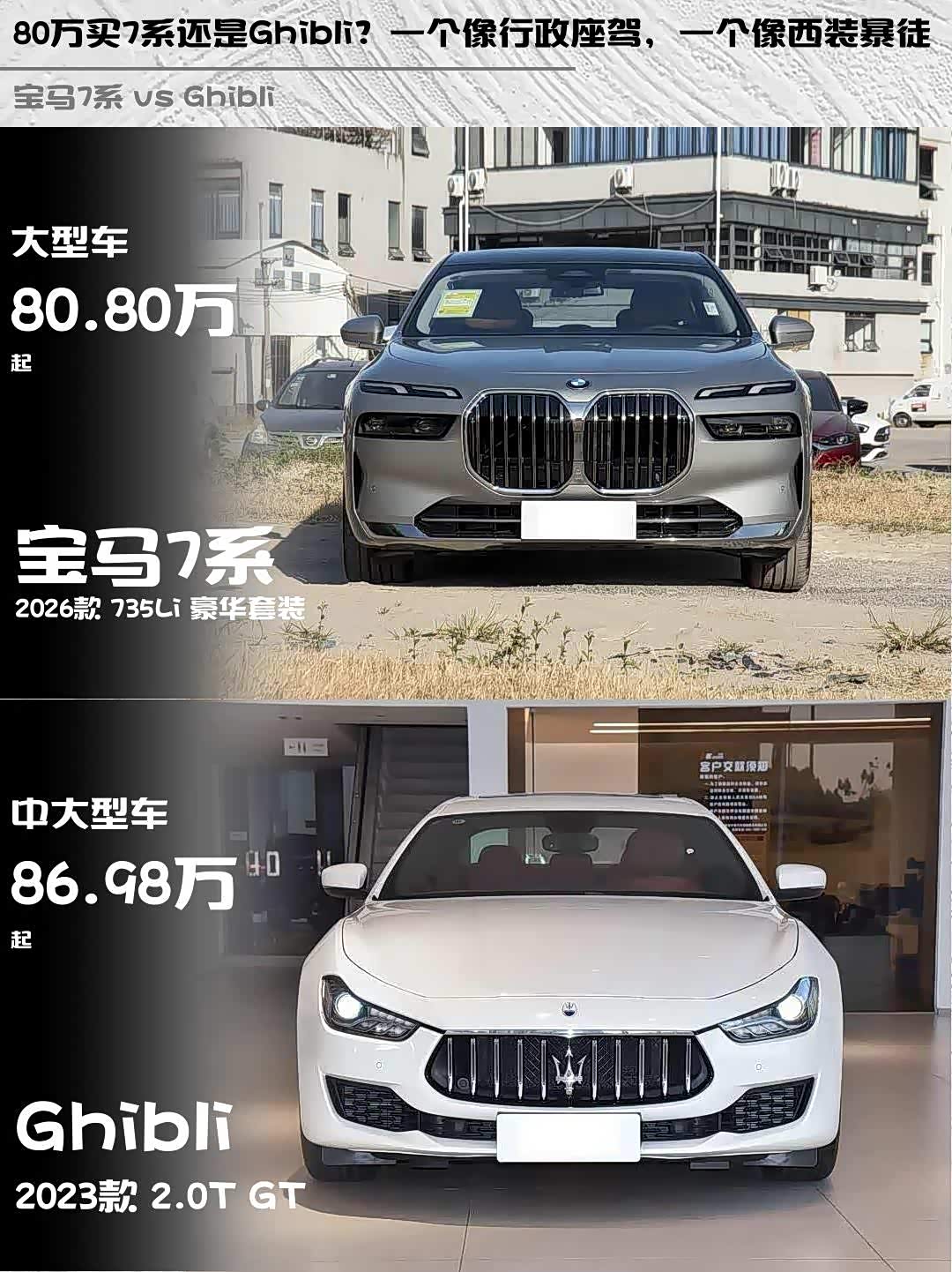 宝马7系(参数|询价) 2026款 735Li 豪华套装 vs Ghibli 2023款 2.0T GT,这两台车放一起对比是不是有点意外?但仔细想想,80万级豪华轿车里,一个主打商务旗舰,一个标榜运动个性,其实很有看头!今天就从真实车主视角聊聊这两台“性格分裂”的大玩具👇