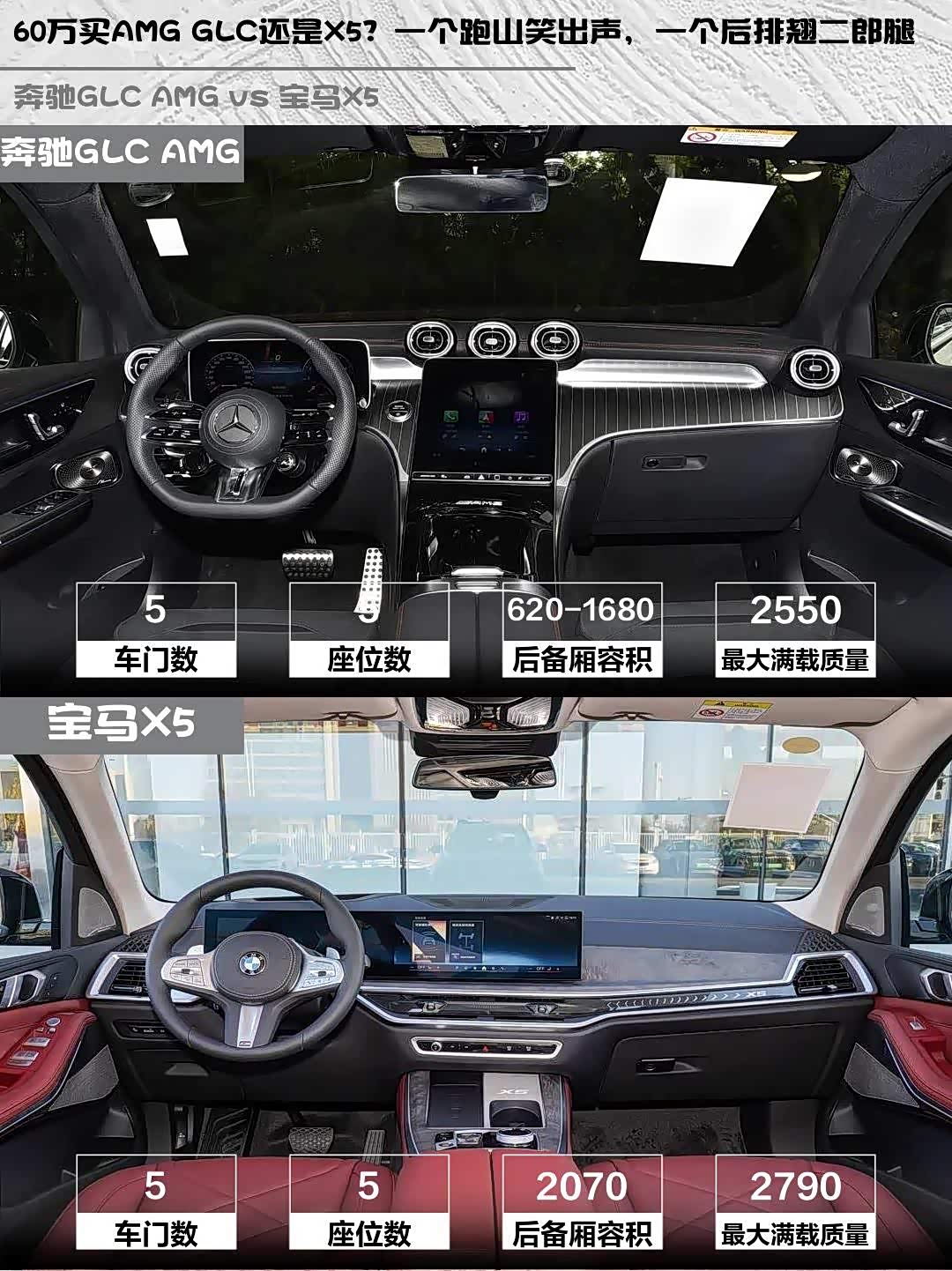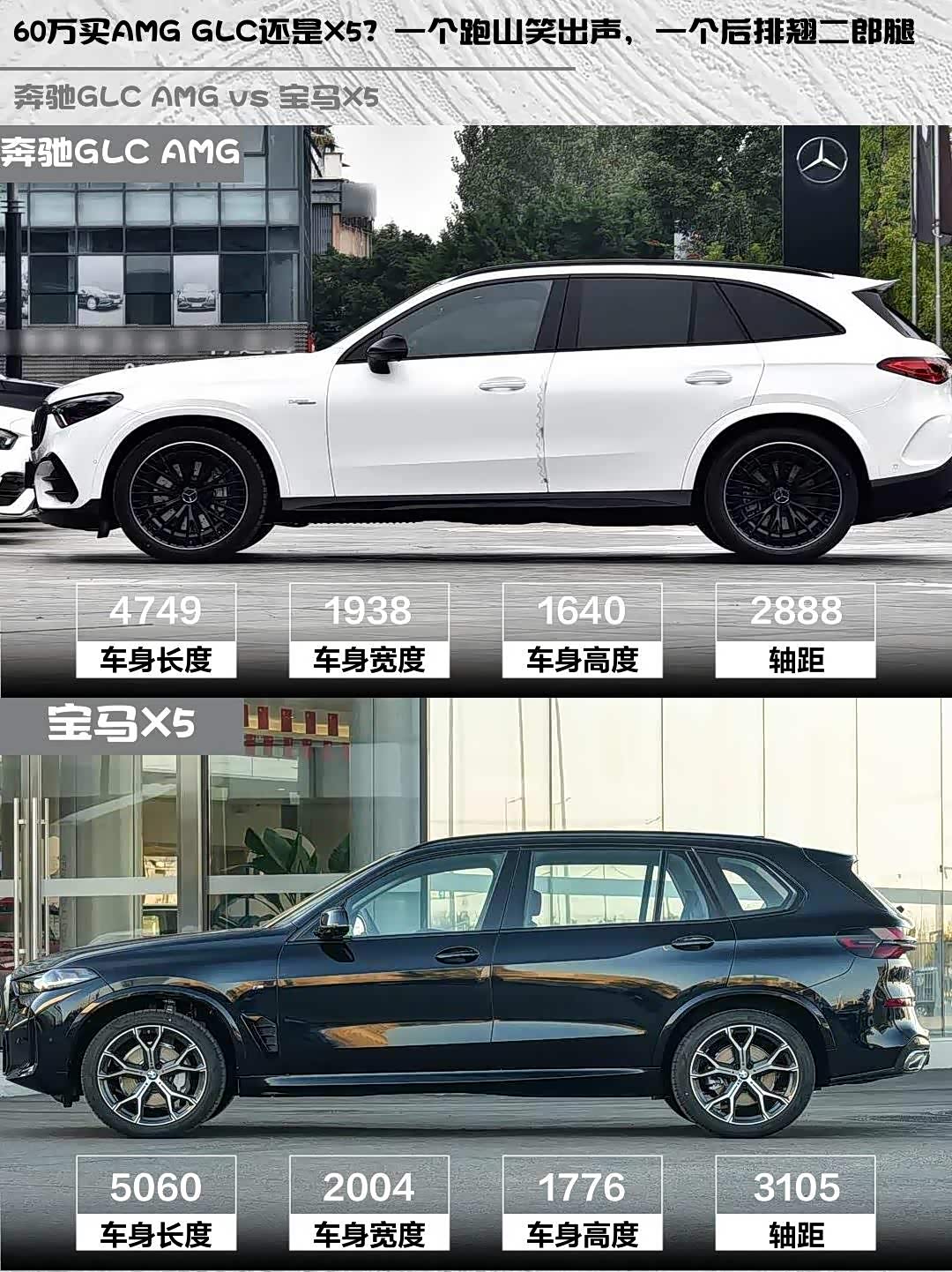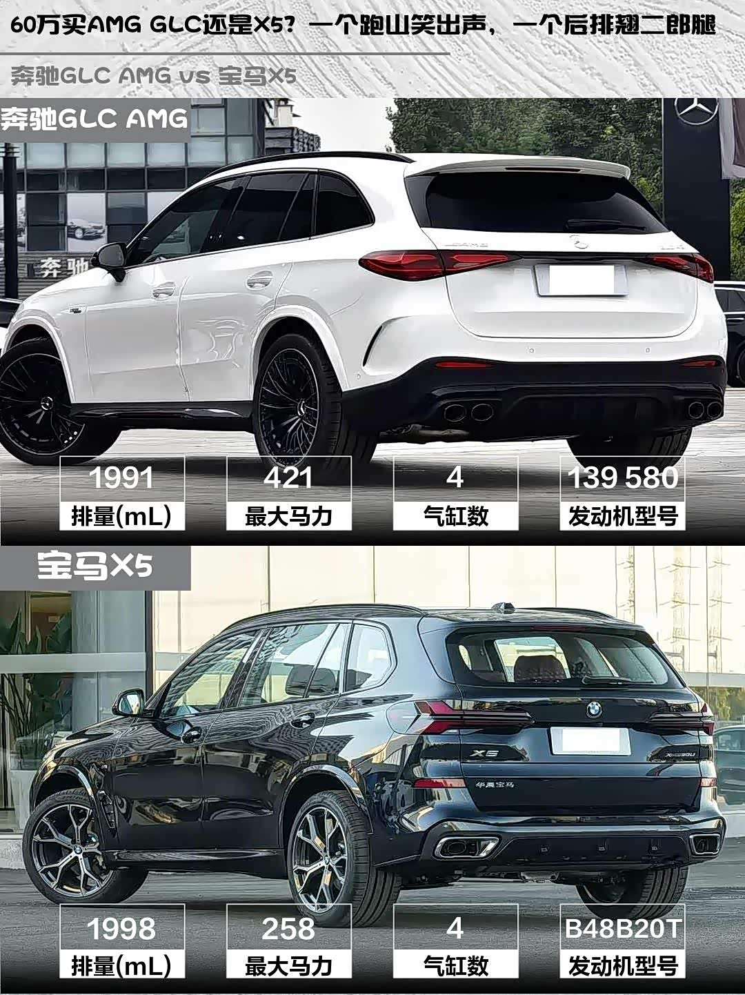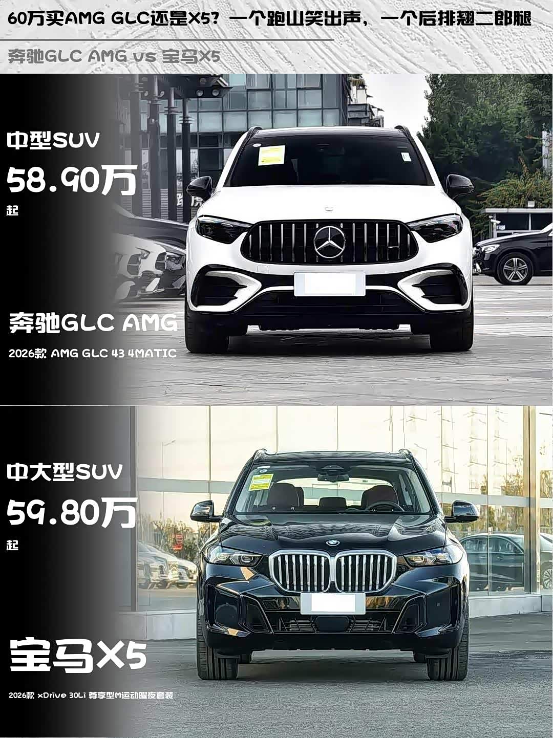 奔驰GLC AMG(参数|询价) 2026款 AMG GLC 43 4MATIC vs 宝马X5 2026款 xDrive 30Li 尊享型M运动曜夜套装,60万预算的性能SUV该怎么选?🤔
