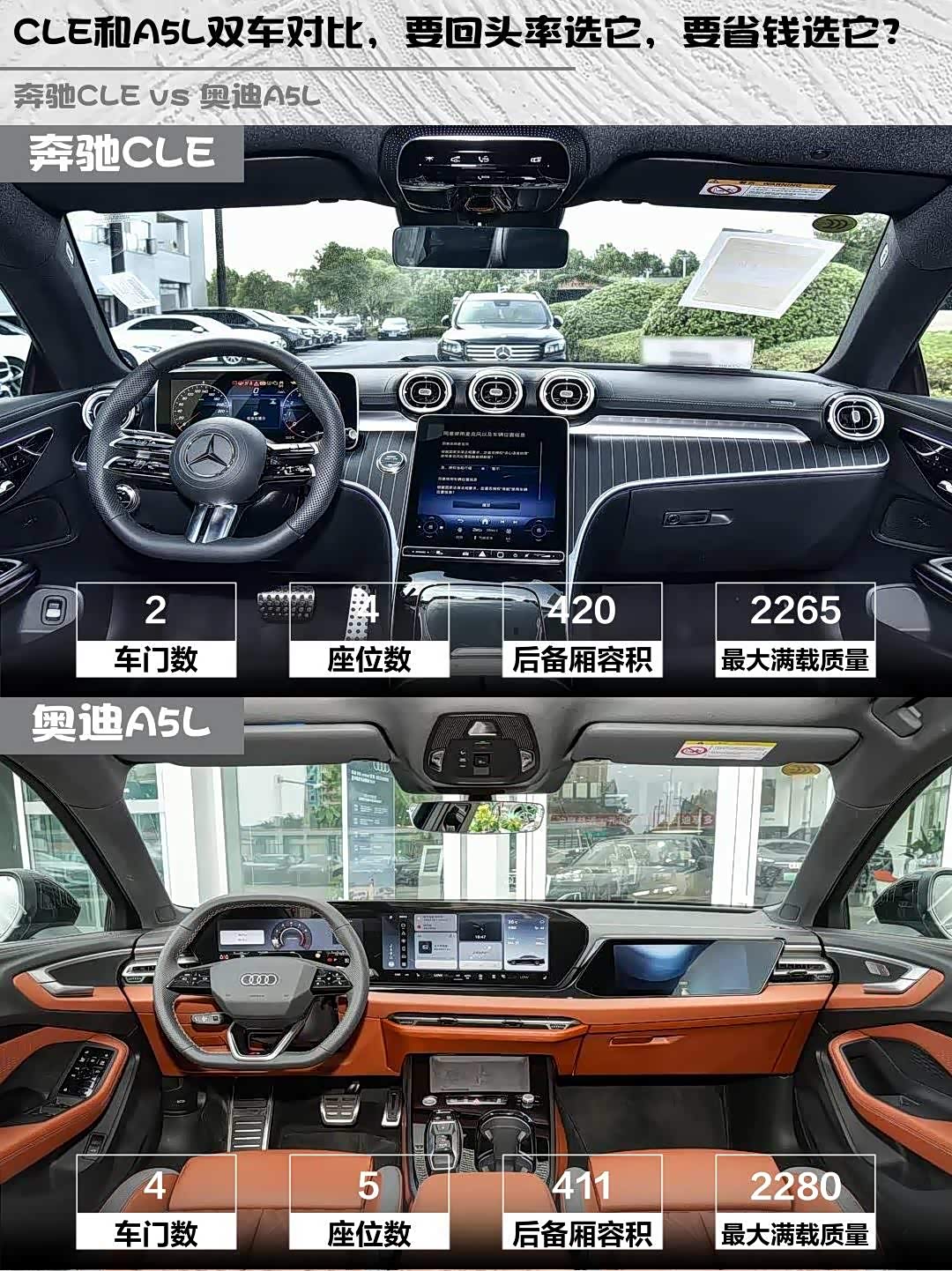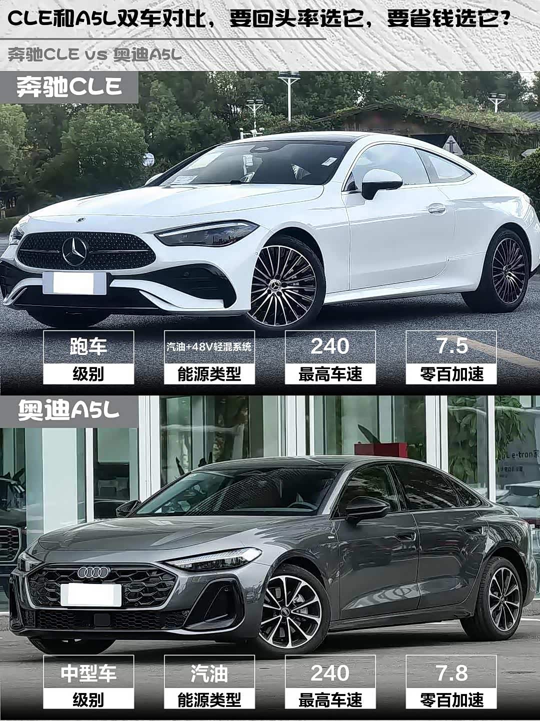 要回头率+驾驶乐趣选CLE,要性价比+家用属性选A5L。预算够的话,CLE的碳纤维内饰和AMG套件绝对能让你成为整条街最靓的仔~而A5L的运动版Plus配置已经足够香,终端优惠后比CLE便宜近10万!