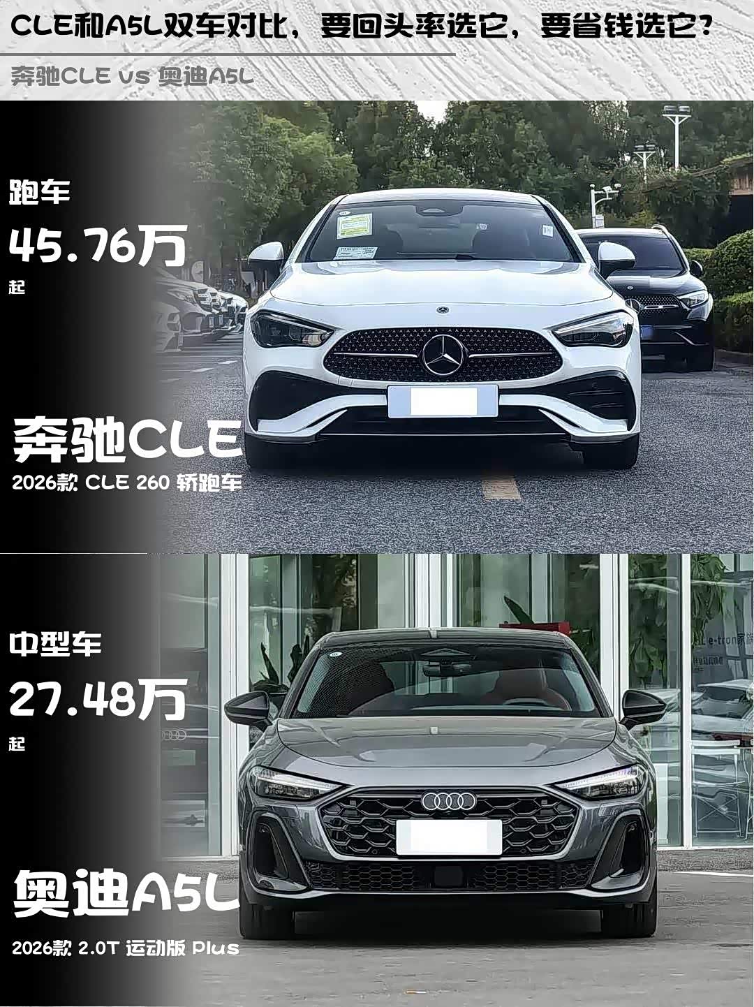 奔驰CLE(参数|询价) 2026款 CLE 260 轿跑车 vs 奥迪A5L 2026款 2.0T 运动版 Plus,这两台德系豪华车该怎么选?🤔 最近陪朋友看车,深度体验了这两台车,分享一下真实感受!