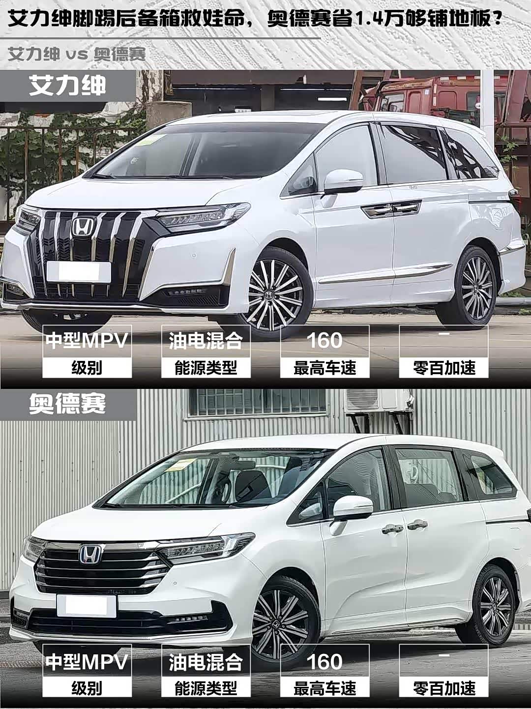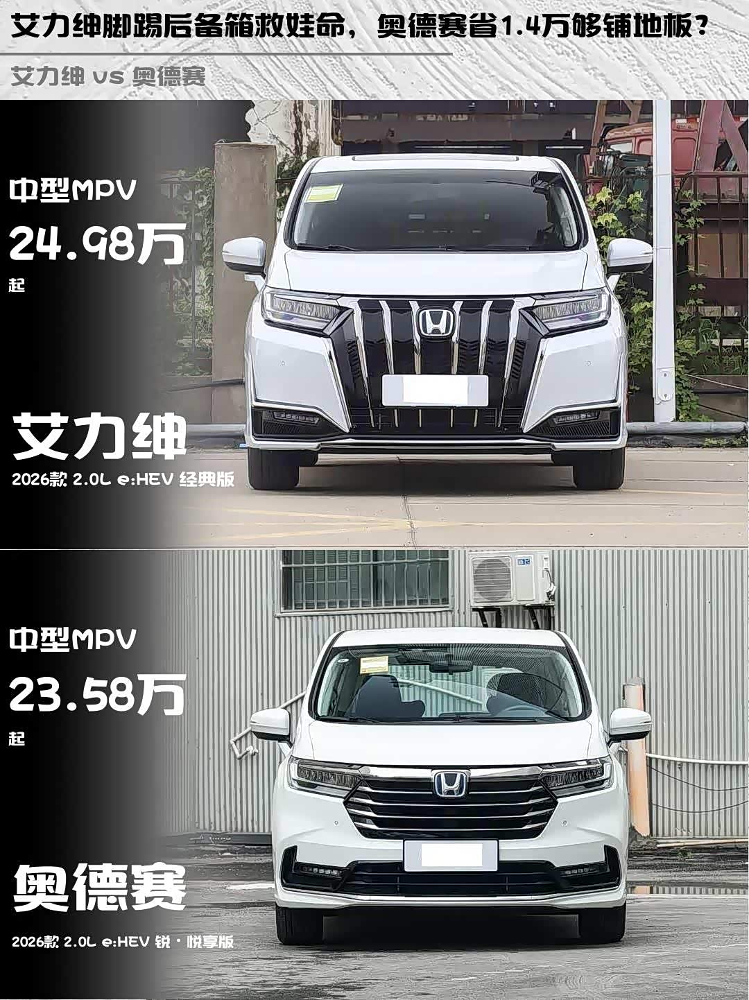 车家号·0浏览·2026-02-15 08:44 · 北京最近在帮朋友选家用MPV,纠结 艾力绅(参数|询价) 2026款 2.0L e:HEV 经典版和奥德赛 2026款 2.0L e:HEV 锐·悦享版,深度对比后发现了不少有意思的细节!🚗💨