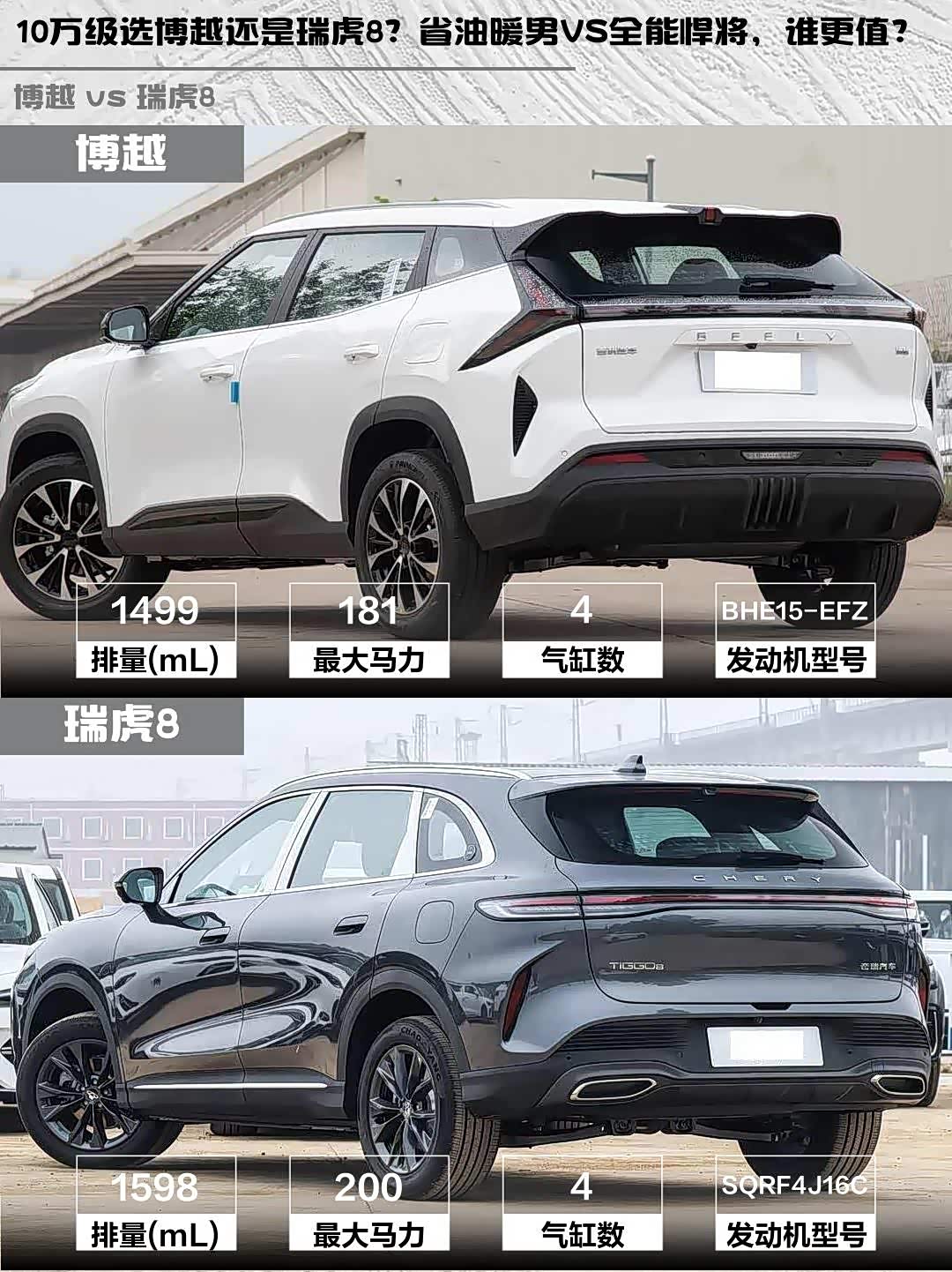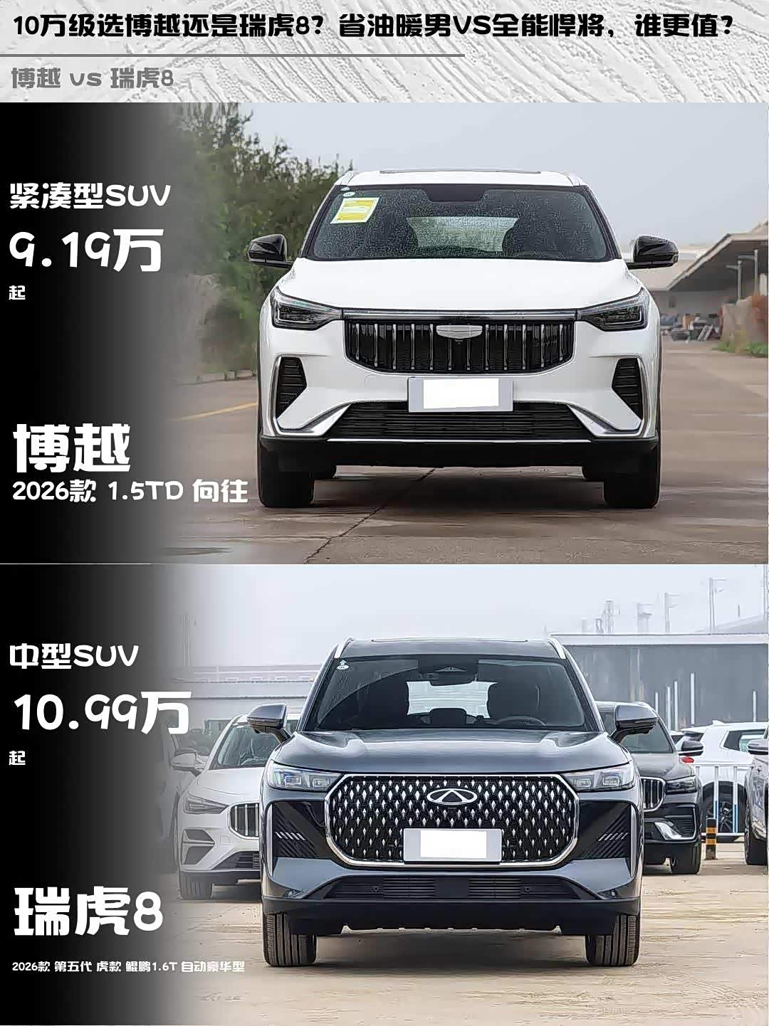 最近身边好几个朋友在纠结选车,10万级SUV里博越2026款1.5TD向往和 瑞虎8(参数|询价)2026款第五代虎款鲲鹏1.6T自动豪华型热度超高🔥 作为深度体验过两台车的老司机,今天从真实用车角度做个硬核对比!