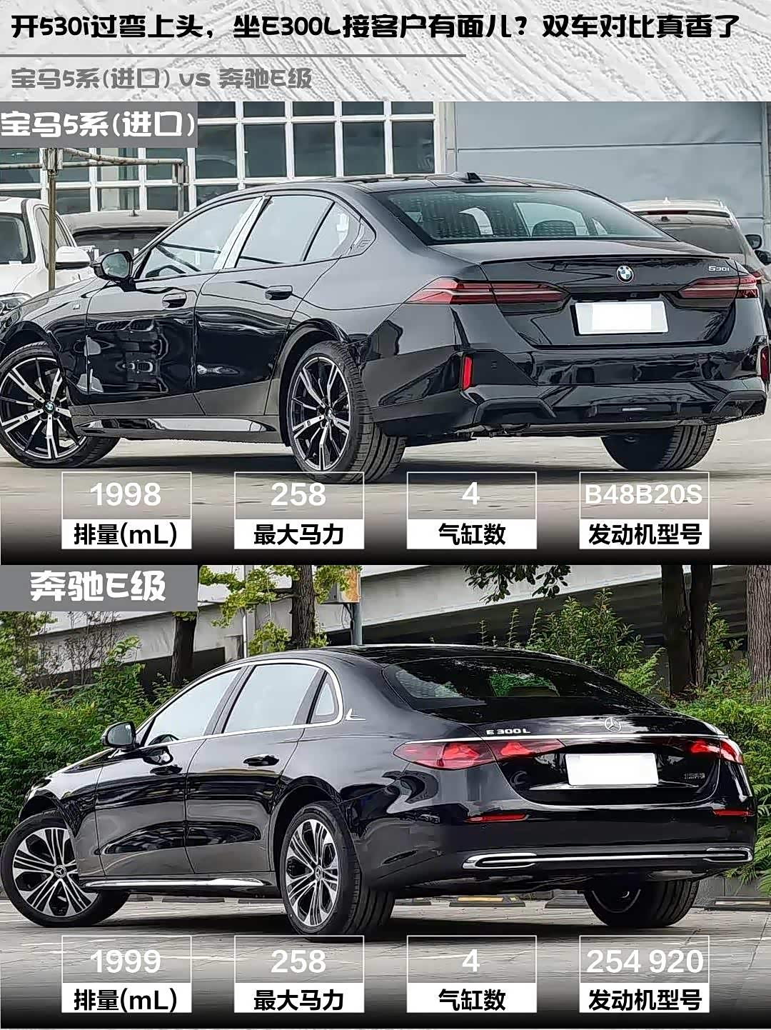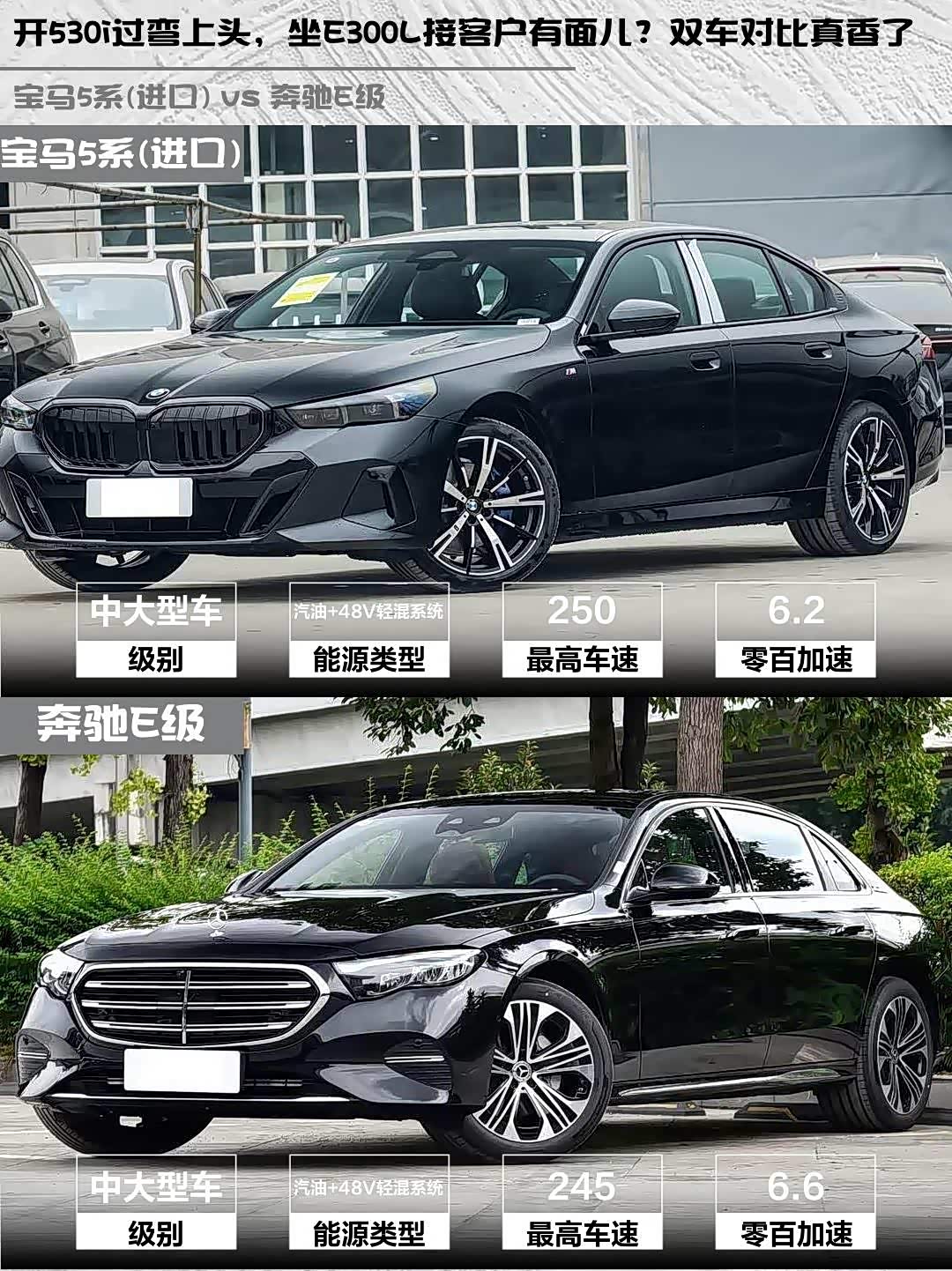宝马5系(进口)(参数|询价) 2024款 530i 尊享型 M运动套装 vs 奔驰E级 2026款 E 300 L 豪华型,50万级豪华轿车怎么选?🤔