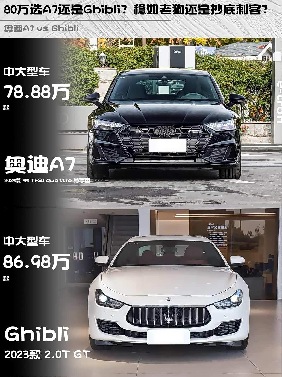 最近在纠结奥迪A7 2025款 55 TFSI quattro 尊享型和 玛莎拉蒂Ghibli(参数|询价) 2023款 2.0T GT的朋友看过来!这两台80万级轿跑到底怎么选?深度对比干货送上👇