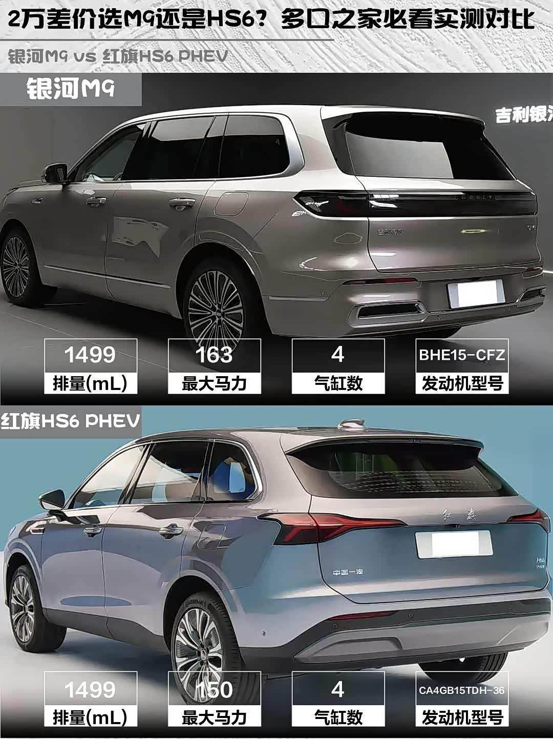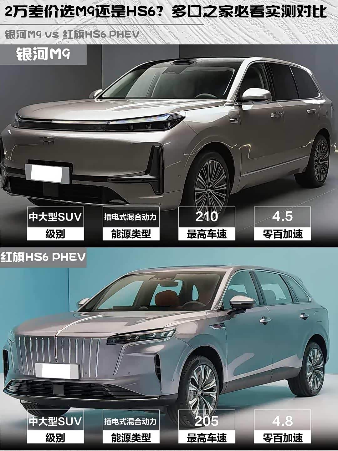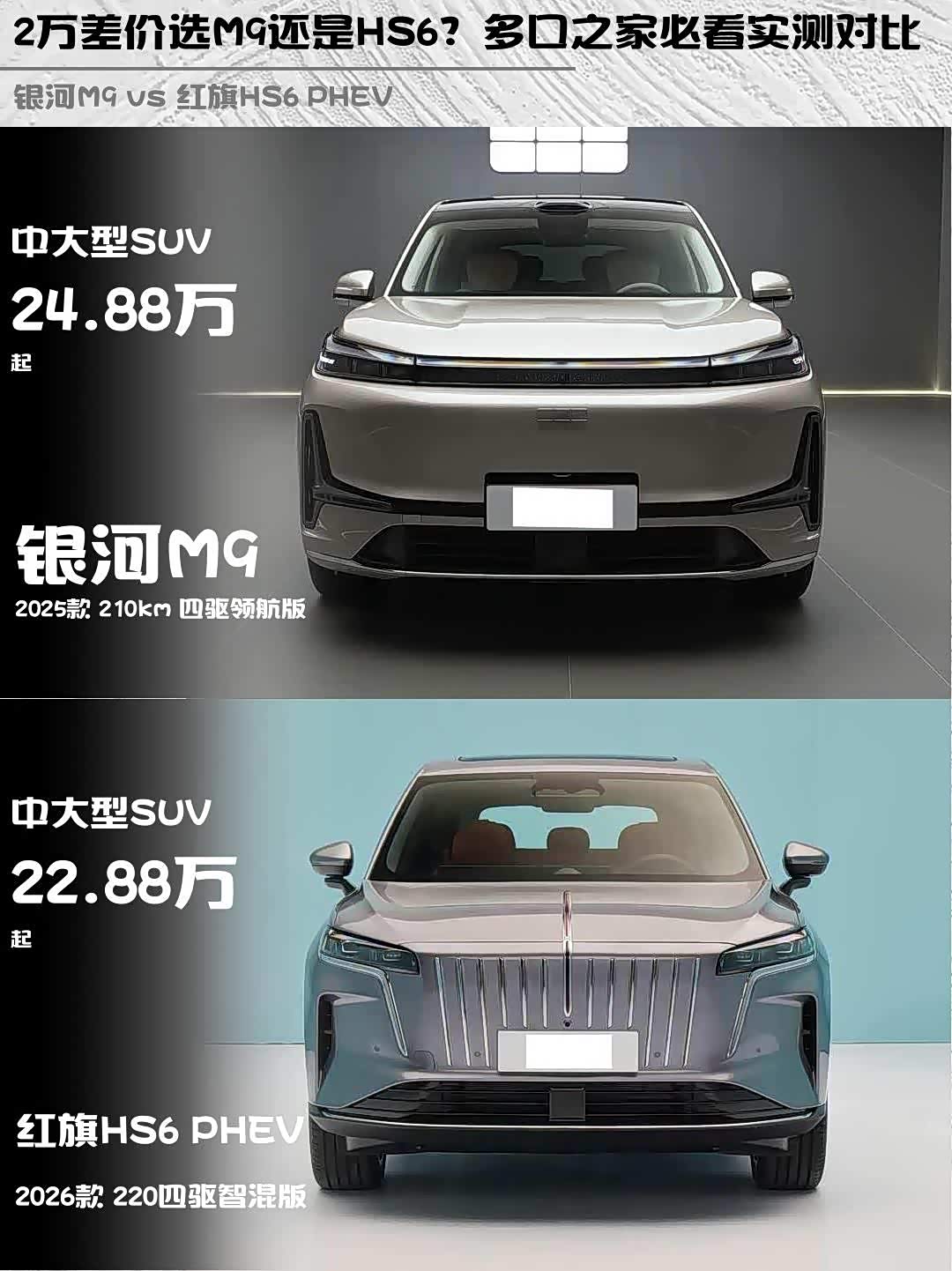 最近在选家用新能源SUV的朋友看过来!银河M9和 红旗HS6 PHEV(参数|询价)这两款25万级插混四驱车真的太卷了,实测对比后掏心窝子分享干货👇