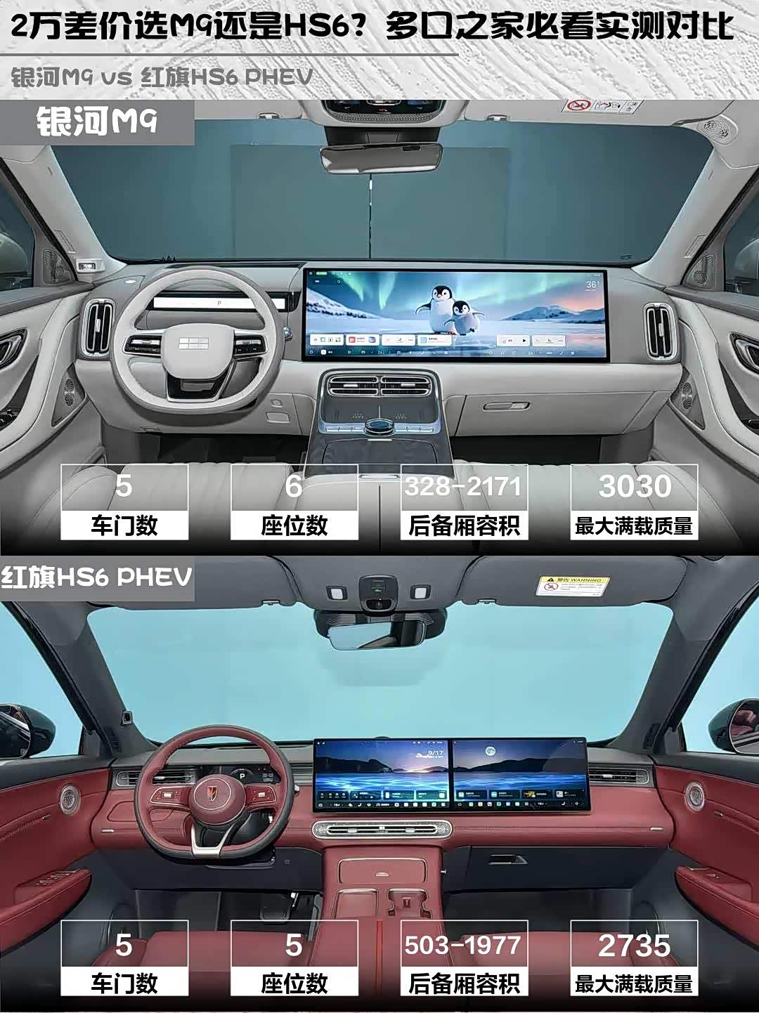 最后说价格:M9领航版24.88万 vs HS6智混版22.88万,2万差价主要差在空间尺寸和动力配置上。要我说,多口之家直接冲M9,追求精致感的选HS6准没错~