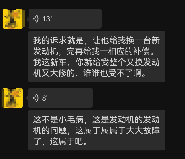 刘先生明确提出了自己的诉求:要求厂家为其更换一台新发动机,并给予相应的补偿。他表示,新车出现这样的问题,无论是发动机维修还是更换,都是他无法接受的,“我这新车,你就给我整个又换发动机又大修的,谁也受不了啊。”