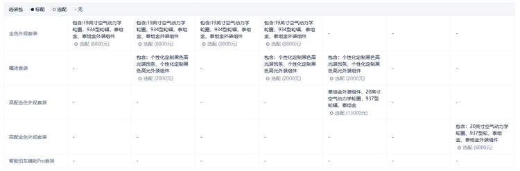 外观颜色提供宝石青、矿石白、碳黑色、量子蓝、闪耀铜灰、磨砂纯灰(选装8000元)、岩石灰等,内饰颜色包含铜棕色/阿特拉斯灰、勃艮第红/黑色、海蓝/黑色等。选装包包括金色外观套装(8800元,含19英寸空气动力学轮圈、泰坦金外装组件)、高配金色外观套装(6800元或13000元,含20英寸空气动力学轮圈、泰坦金外装组件)、曜夜套装(2000元,含个性化定制黑色高光装饰条及外装组件)、智能泊车辅助Pro套装(未标注价格)等,不同车型可选装项目略有差异。