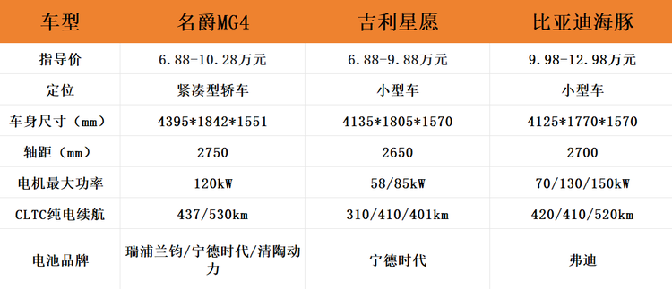 不止是尺寸,在消费者比较关注的续航里程方面,同样是6.88万元的起售价格,名爵MG4搭载了一组容量为42.8度的电池包,CLTC纯电续航里程达到了437km(有意思的是,海豚接近45度电只能跑420km),而吉利星愿入门版车型的纯电续航里程则是只有310km。