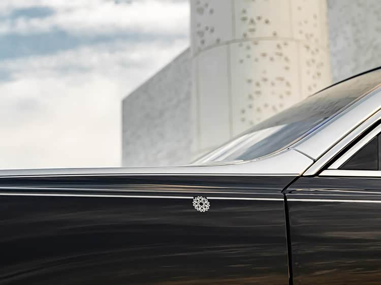 外观采用钻石黑与银色双色车身,最亮眼的是历时5年研发的专利激光雕刻引擎盖,图案源自中东传统Mashrabiya木格栅建筑元素,光线变化下呈现不同视觉效果,搭配暗铬发光格栅与欢庆女神立像。车身尺寸5992/2018/1650mm,轴距3772mm,保持4门4座布局。