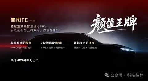 第三张牌是智慧纯电FUV,代号岚图FE,专为年轻人打造,同样搭载L3级智能辅助驾驶硬件,以及领先一代的AI交互智能座舱,从图片来看,大概率是主打颜值 + 智能 + 操控。