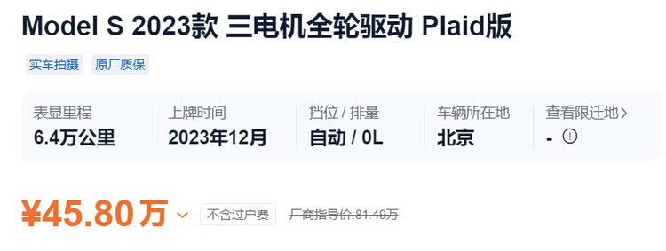 我查询了一下,发现2023款 三电机全轮驱动 Plaid版的二手车价格为45.80万元,该车售价81.49万元,两年多的时间跌了35.69万元,保值率远远不及燃油豪华C级车。当然,二手车一车一况,车况好的话,价格高一些,车况不好的话,价格低一些,而这款车跑了6.4万公里,平均一年跑3万多公里,而且有过2次过户记录,全车原版原漆,没有发生过重大安全事故,车况还不错。