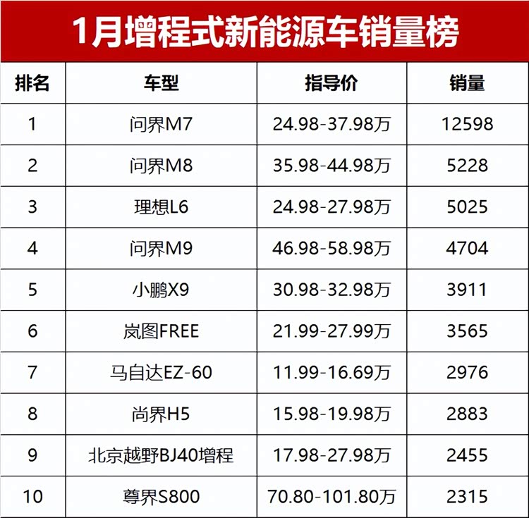 从乘联会的销量榜单来看,问界品牌无疑是1月最大的赢家。 问界M7(参数|询价)以12598辆的成绩毫无悬念地拿下榜首,这个数字几乎是第二名问界M8(5228辆)的两倍还多。作为一款起售价24.98万的中大型SUV,M7能在车市寒冬中保持如此强劲的势头,确实让人刮目相看。