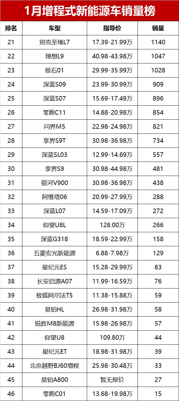 值得注意的是,一些高端增程式车型也在1月取得了不错的成绩。尊界S800以2315辆的成绩排在第10位,这款起售价70.8万的豪华轿车,在高端市场依然有不少拥趸。而仰望U8则以44辆的成绩排在第42位,虽然销量不高,但作为一款百万级的硬派越野SUV,能在1月取得这样的成绩已经实属不易。
