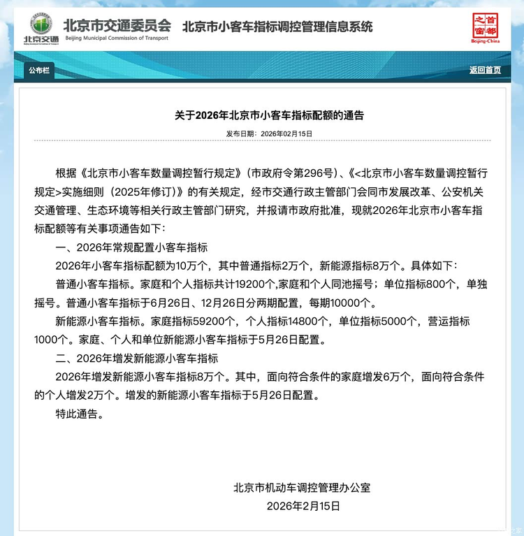 北京于2月15日正式公布了2026年度小客车指标配额及具体配置方案。与往年相比,新一年的政策在总量与结构上均做出了重要调整,核心在于大幅增加了新能源小客车的指标供给。