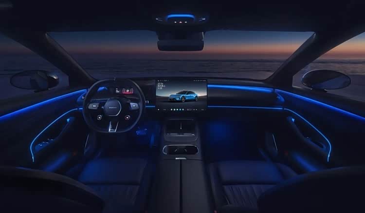 先说最直观的变化。卡布里蓝车漆确实惊艳,阳光下泛着海蚀洞那种青蓝光泽。前格栅重新设计了,毫米波雷达藏在里面,大灯还是那个水滴造型,远光能照400米。尺寸没变,4997毫米车长、3米轴距,还是C级轿跑的底子。内饰暗夜黑配色,方向盘造型改了,缝线工艺更细了,软包面积明显增加,门板上的质感比老款提升了一个档次。
