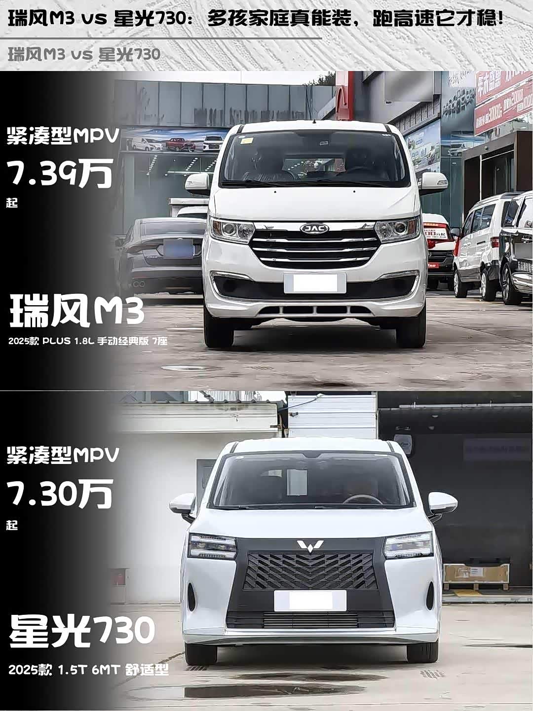 最近后台好多人在问7万级家用MPV怎么选,刚好深度体验了瑞风M3 2025款 PLUS 1.8L 手动经典版 7座和 星光730(参数|询价) 2025款 1.5T 6MT 舒适型这两款热门车,直接上干货对比!🚗💨