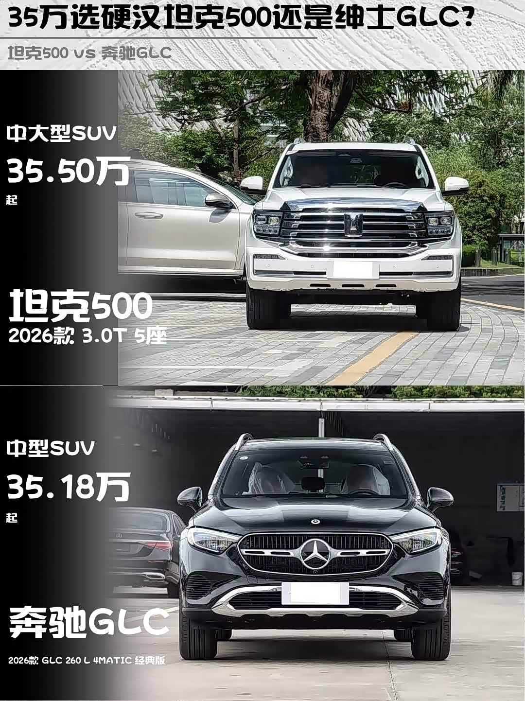 最近在纠结 坦克500(参数|询价) 2026款 3.0T 5座和奔驰GLC 2026款 GLC 260 L 4MATIC 经典版的朋友看过来!作为深度体验过两台车的“老司机”,掏心窝子分享真实对比感受👇