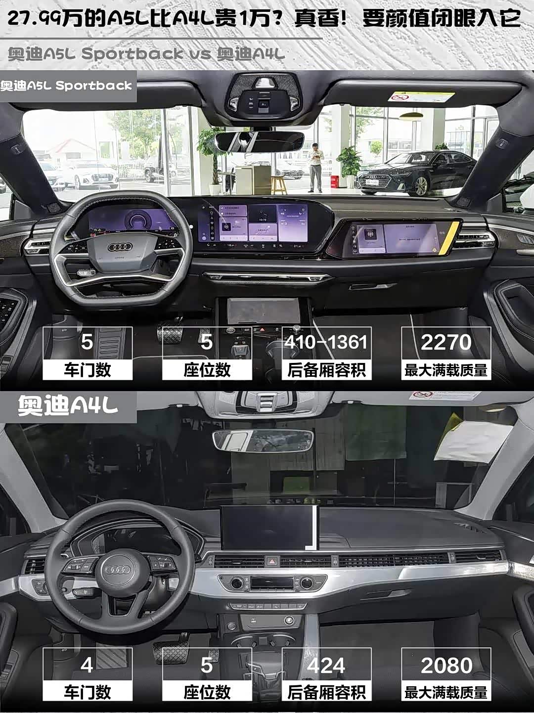 A5L豪华型27.99万比A4L悦享版28.98万还便宜近1万,但配置反而多了矩阵大灯、座椅通风等豪华配置。不过A4L现在终端优惠更大,落地价可能更香。