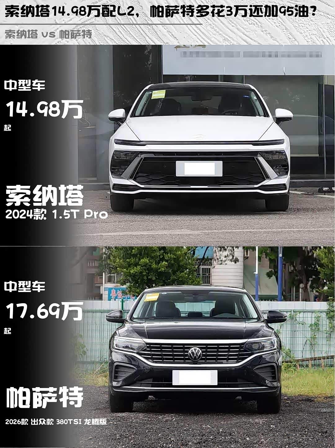 索纳塔1.5T Pro指导价14.98万,帕萨特380TSI龙腾版17.69万,差价近3万!索纳塔还标配L2辅助驾驶,性价比简直犯规。不过帕萨特保值率确实高,看你是要现在省钱还是以后卖车少亏~