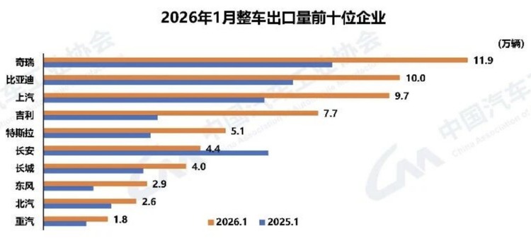其中,奇瑞集团1月出口11.9万辆,同比增长47.2%,连续9个月破10万大关;吉利出口6.05万辆,同比增长1.4倍。此外,比亚迪海外销量首次单月突破10万辆;上汽出口9.7万辆,同比均实现大幅增长......