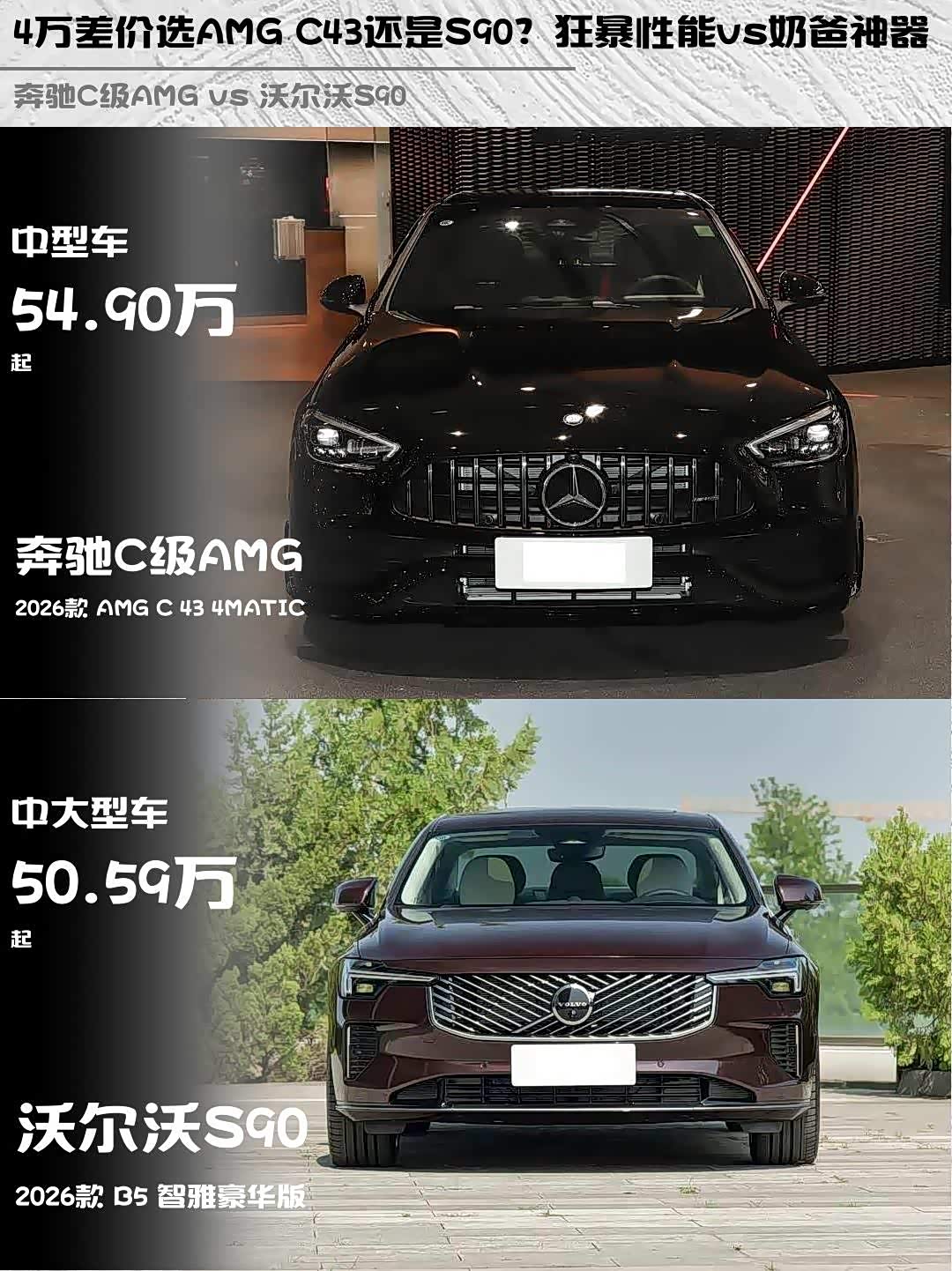 车家号·0浏览·2026-02-17 08:35 · 北京奔驰C级AMG(参数|询价) 2026款 AMG C 43 4MATIC vs 沃尔沃S90 2026款 B5 智雅豪华版,这两台车放一起对比,真的有点“西装暴徒”遇上“北欧绅士”的感觉!🔥