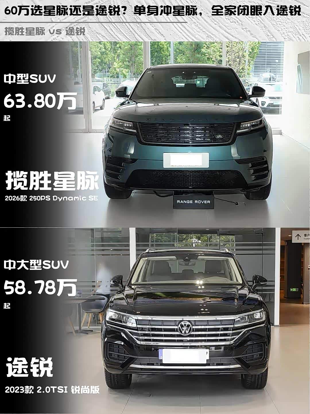 车家号·0浏览·2026-02-17 08:37 · 北京最近后台好多兄弟在问60万预算选SUV, 揽胜星脉(参数|询价)2026款250PS Dynamic SE和途锐2023款2.0TSI锐尚版怎么选?今天直接上干货对比!🔥