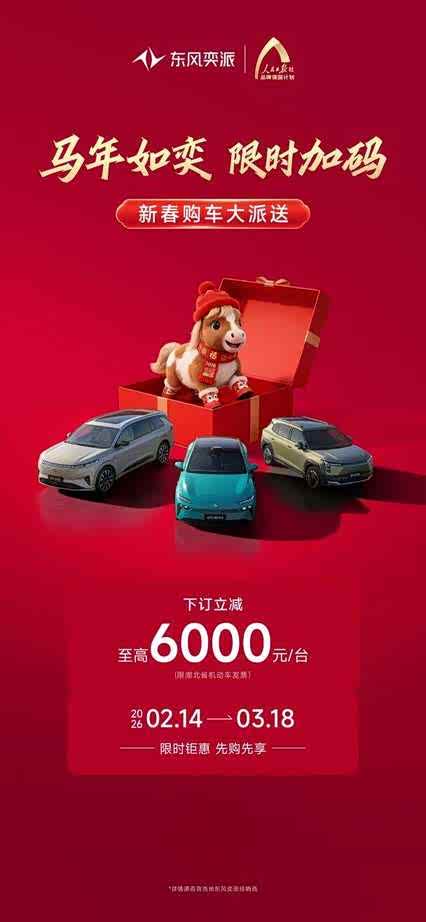 开门红,福利送!马年伊始,东风奕派便为广大消费者送上了一份“开年大礼”,推出以“马年如奕 限时加码”为主题的限时购车政策,旨为大家带来“马上省钱、马上用车、马上享福”的高价值新年出行体验!