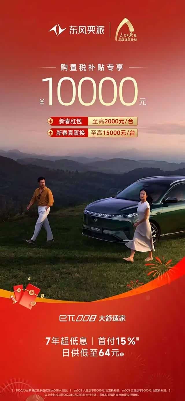 备受家庭用户青睐的“大舒适家”奕派008,以“真满配、真智能、真超值”全能产品力满足用户多元化需求。值新春之际,推出限时10000元专享购置税补贴、至高15000元置换补贴等福利;此外,即日起至2月28日前,凡在东风奕派官方APP/小程序下订奕派008的用户,还可领取2000元“马利”红包,为新的一年增添“马上有利”好彩头!在金融端,还推出7年超低息、首付15%起、日供仅64元起购车政策,让更多家庭轻松升级出行品质。作为家庭SUV的价值标杆,奕派008以更高品质、更具温度的体验,重新定义家庭出行新高度。