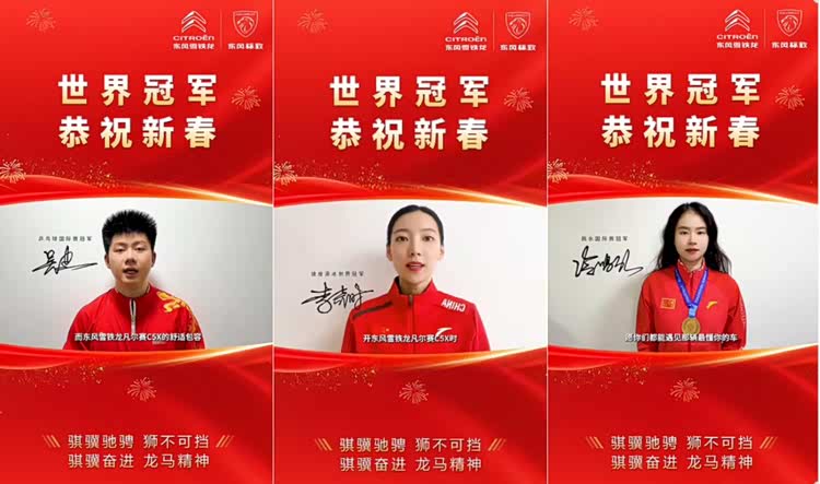丙午马年奔腾而至,神州大地喜气盈门。东风标致与东风雪铁龙携手乒乓球国际赛冠军吴迪、速度滑冰世界冠军李奇时、跳水国际赛冠军冷鸣弘三位世界冠军天团成员,共同恭贺新春。三位冠军以拼搏精神为底色,讲述赛场上的精准掌控与从容发力,并共同推荐东风标致508L与东风雪铁龙凡尔赛C5 X两款法式旗舰车型,同时以“稳中求进、掌控自如”的新春祝愿,致敬每一位在生活中拼搏向前的奋斗者。