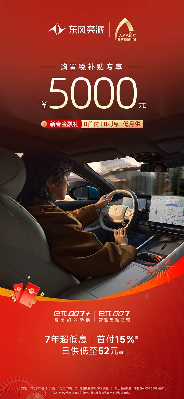 福利限时享,好车不等人!东风奕派始终坚守“以用户为中心”的理念,从产品研发到服务升级,从权益福利到试驾体验,用心对待每一位用户的选择,用诚意回馈每一份信赖。开年购车正当时,除了奕派007系列、奕派008、纳米06三款主力车型,“大美智能国民车”纳米01也携新春专属权益而来,4000元购置税补贴、5年0首付0利息的新春金融礼等福利同步上线,为消费者提供更丰富的出行选择。东风奕派这份“开年大礼”多重权益叠加,此时入手新车便是最佳时机!诚邀广大消费者莅临东风奕派授权门店,近距离试驾品鉴,挑选心仪爱车,与家人朋友一同开启不“奕”样的美好新年旅程。