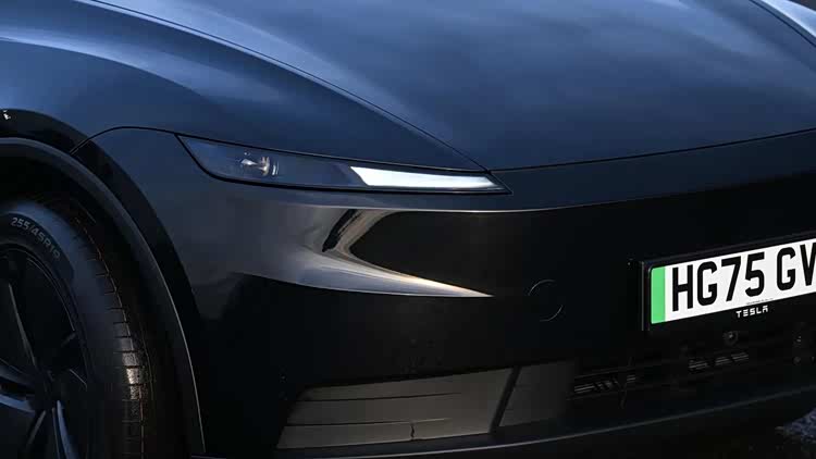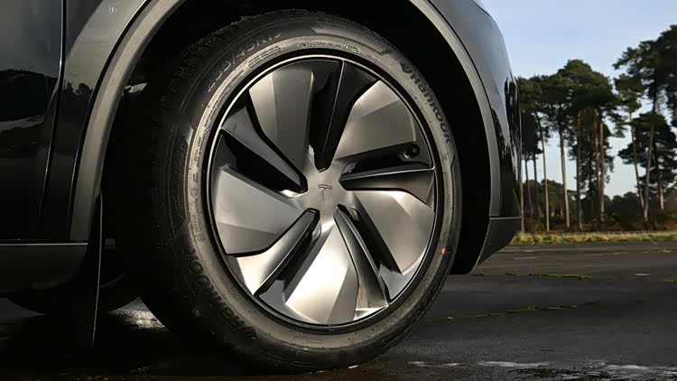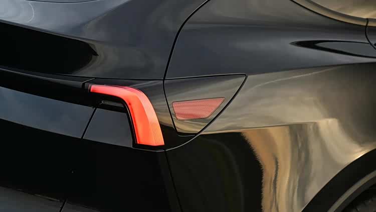 车身侧面,由于白车身不会有变化,所以倒是没有特别大的调整,标志性的Model Y跨界车线条引领了风尚,至今也不算落后,隐藏式车门把手不会缺席,标准的黑色车漆尽量节约的成本,而轮毂造型显然也是最低配,一块塑料面板覆盖,增强了气动效果,韩泰轮胎显示了节约的目标,18英寸有效的提升了舒适性。而在车尾部分,最显著的不同当属尾灯,新款Model Y标志性的散射式贯穿式尾灯光源,被极简化到只有两侧弯折的红色灯带和小巧的转向灯加刹车灯组,还是有一股网约车气息。