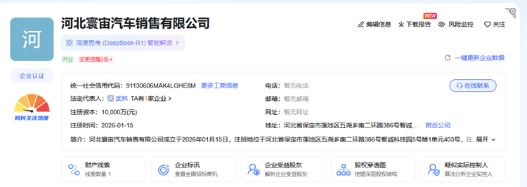 往下深扒河北寰宙汽车销售有限公司的来历之后,事情变得有意思了起来。根据公开信息,这家公司在2026年1月15日才刚刚成立,且登记地址与长城汽车总部同在保定市莲池区。要知道保定又不是北上广深,大量产业高度集中,如此的“巧合”不免让人猜测,FX后续的这3款新车,不会又是长城某些车的美国兄弟吧。