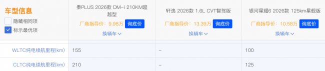 2026款秦PLUS DM-i拥有210km纯电续航,25.28kW·h大电池,不管是日常通勤还是周末出游,纯电都能全面覆盖,星耀6虽然也可实现纯电出行,但仅搭配17度的电池,纯电续航也只有125km,只能将将满足日常出行,再看轩逸只能烧油,不仅噪音更大,也跟绿色出行的理念背道而驰。