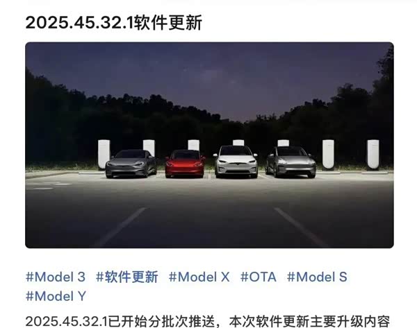 目前已经向特斯拉所有车型分批次推送的软件更新版本为2025.45.32.13,主要升级内容为:1、嘿 特斯拉,车主通过语音唤醒使用语音指令,可以在控制 > 语音面板打开语音唤醒。2、“自动化” 应用程序:使用全新的 “自动化” 应用程序打造个性化的用车体验。3、新增酷狗音乐应用。4、行车记录仪动态录制时长,自动调整容量确保能保留更长时间的视频供用户查看。5、新增QQ音乐伴唱模式,能自由调节人声与伴奏比例。6、玩具箱喷漆车间:使用车窗贴膜、个性车身贴膜和车牌来定制您的特斯拉外观。设置路径:前往应用程序 > 玩具箱 > 喷漆车间,或在控制 > 软件中点击车漆按钮。7、超级充电站聚合显示:相邻较近的超级充电站现在会聚合成簇显示。8、微信互联,设置路径:点击导航搜索框 > 手机 > 激活按钮启动服务,根据引导在手机端激活服务后,即可将微信里的地址直接发送到您的特斯拉。9、搜索附近停车方便快捷。10、地图版本升级更新:CN-2025.44-15553。