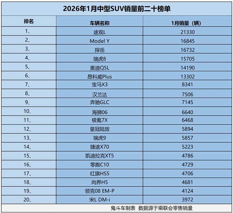 市场一片乱战,但1月中型SUV市场销量表现很一般,鬼哥根据1月份乘联会零售销量数据,整理1月中型SUV前二十销量榜单,结果发现,1月份,仅有6款中型SUV销量过万,接下来,看看具体车型排名与销量表现。