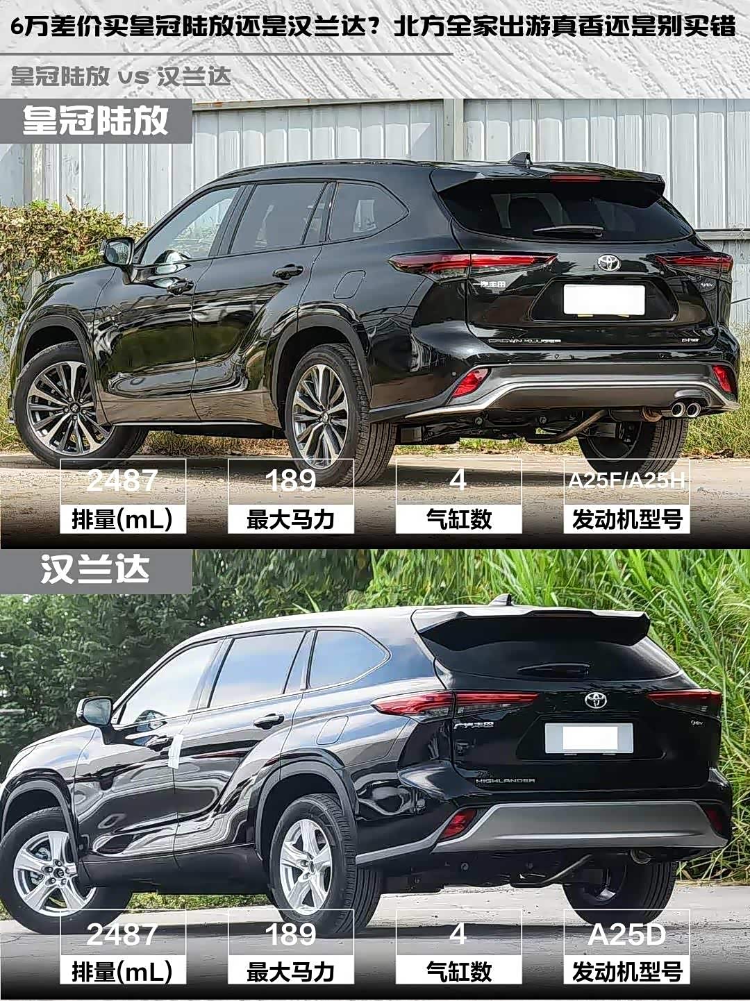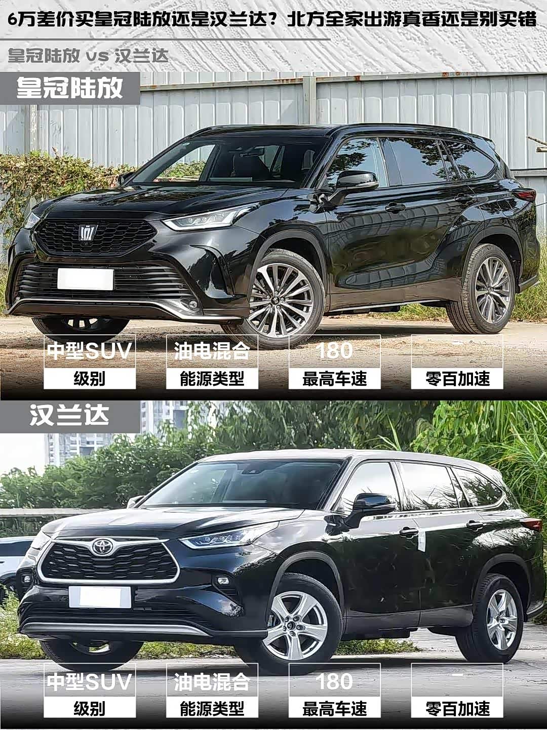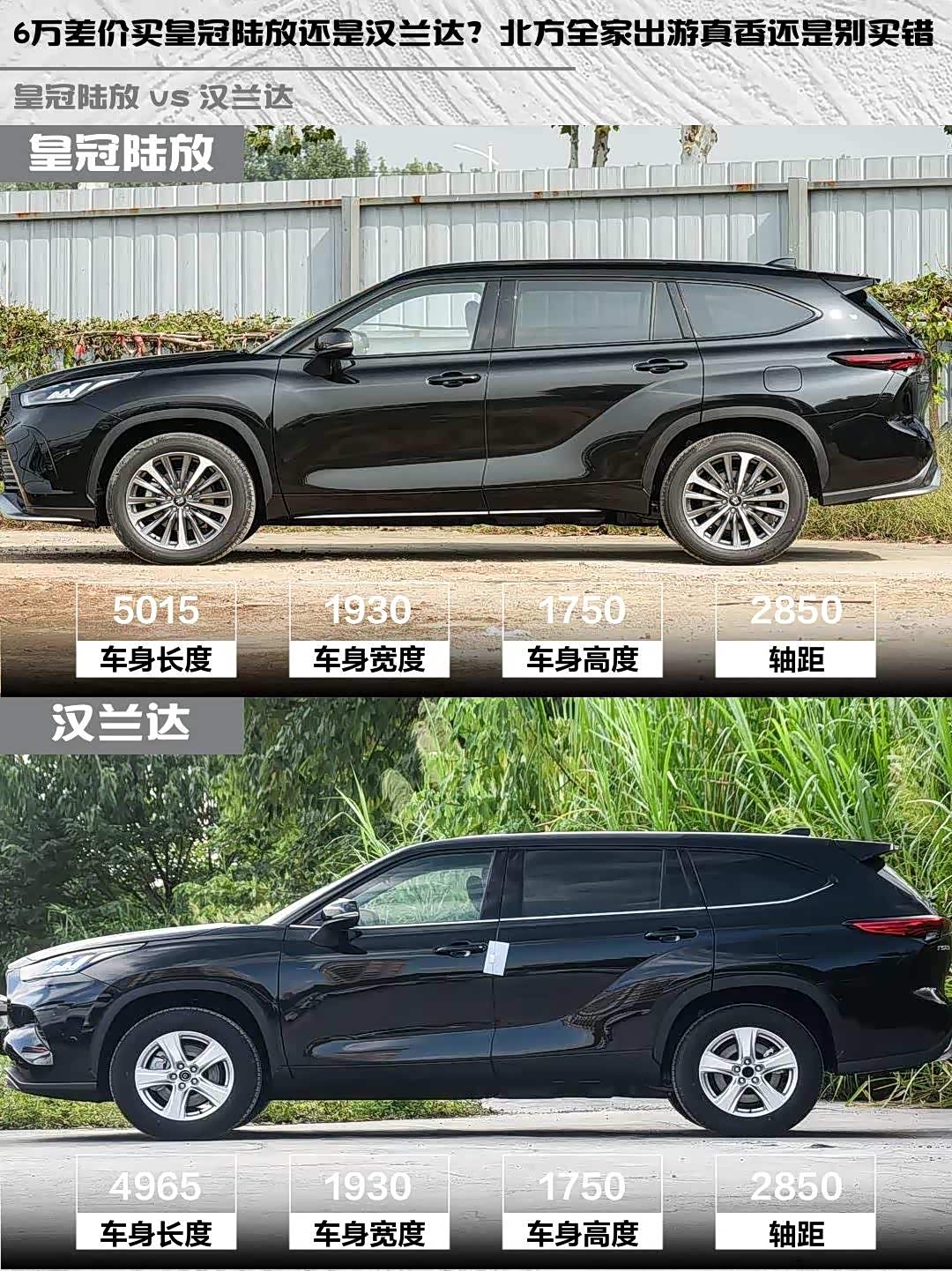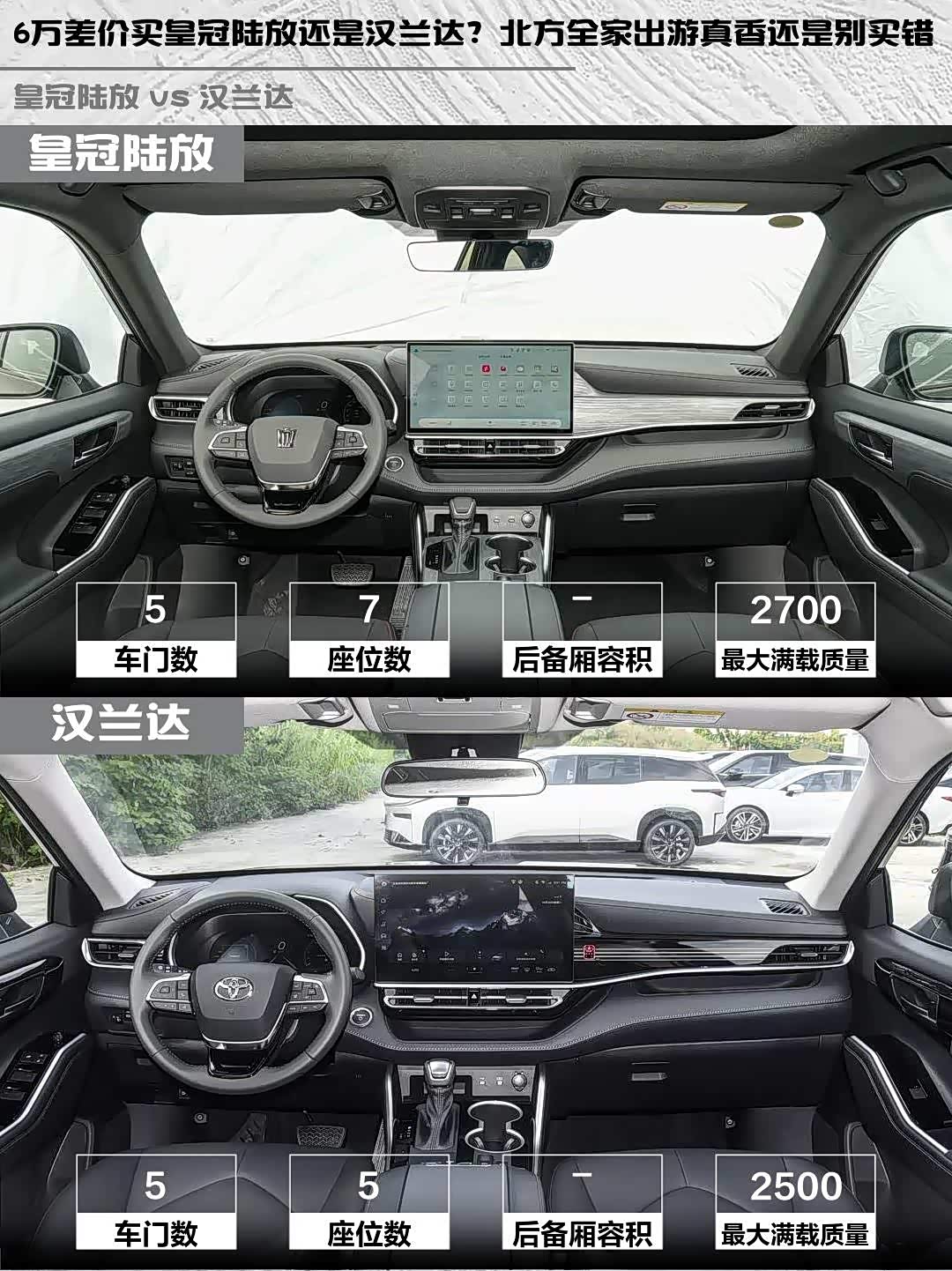 要豪华感和四驱选皇冠陆放,它的皇冠标+20寸轮毂气场确实强,内饰红黑翻毛皮也比汉兰达的塑料感高级。但汉兰达优惠后裸车不到19万,性价比更高,适合预算有限又想要靠谱混动的用户。个人觉得如果经常全家出游,皇冠陆放的7座和四驱更实用;要是就日常代步,汉兰达5座版完全够用还省钱。
